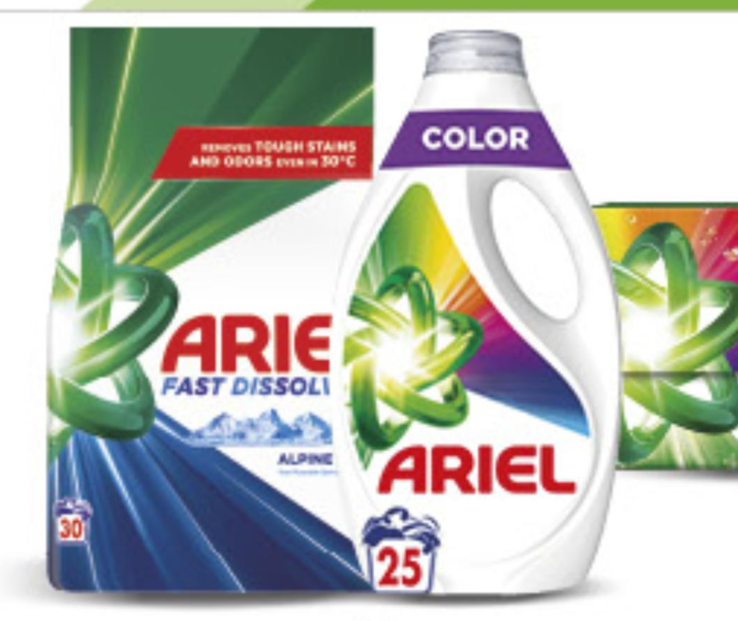 Ariel deterdžent za strojno pranje rublja dostupan je u više oblika: prašak od 2,2 kg (dovoljan za 40 pranja), gel od 1,8 L (također za 40 pranja) i tablete u pakiranju od 30 komada. Ovaj deterdžent osigurava dubinsko čišćenje i uklanjanje mrlja, ostavljajući rublje blistavo čistim i svježim. Trenutno je dostupan po sniženoj cijeni od 9,99 EUR, što predstavlja popust od 44% u odnosu na redovnu cijenu od 17,99 EUR.
