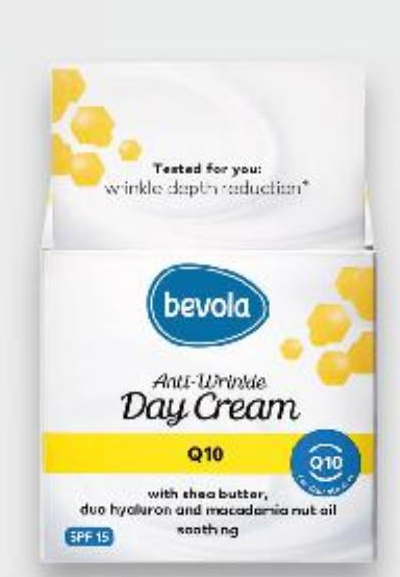 Bevola Anti-Wrinkle Day Cream Q10 je dnevna krema za lice namijenjena borbi protiv bora, obogaćena koenzimom Q10. Sadrži shea maslac, duo hijaluronsku kiselinu i ulje makadamije, pružajući koži intenzivnu hidrataciju i njegu. Krema također ima SPF 15 za zaštitu od sunca. Dolazi u pakiranju od 50 ml. Trenutno je dostupna po cijeni od 2,29 € uz 20% popusta. Cijena po litri iznosi 45,80 €. Ova krema je savršen izbor za svakodnevnu njegu i zaštitu kože.